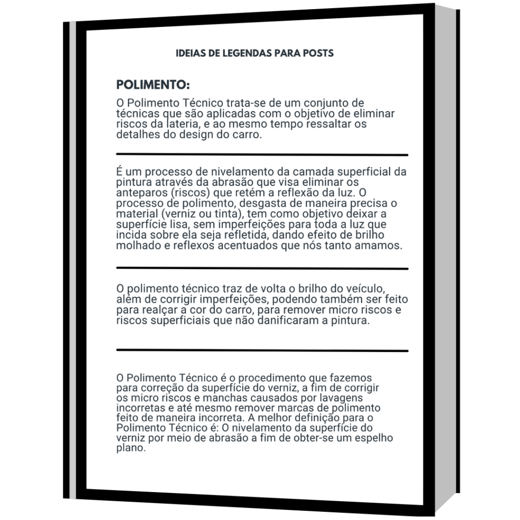 Desenvolvi essas ideias de legendas para facilitar ainda mais a criação dos seus conteúdos. Com várias ideias de vários serviços que temos na Estética Automotiva, para usá-las você simplesmente só precisa copiar e colar.