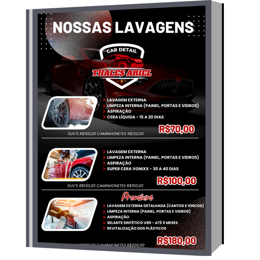 A ideia desse Cardápio é ter em mãos um documento explicativo das lavagens que você têm disponíveis na sua Estética. Poder discriminar cada detalhe de cada lavagem, vai fazer total diferença no momento do atendimento, facilitando a escolha do cliente. Pode usá-lo no digital mas recomendo imprimir e plastificar para usar no atendimento presencial.